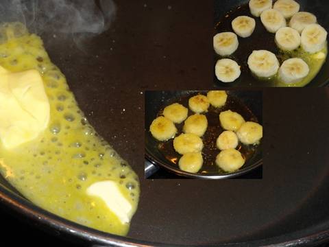 Cortar el plátano en rodajas de 1 centímetro. calentar la mantequilla a fuego medio y cocinar las rodajas de plátano hasta que estén doradas. Cinco minutos aproximadamente.
