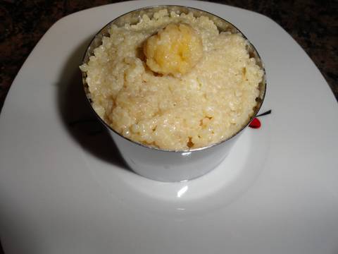 Poner un aro pequeño en los platos y rellenar con el cous cous con plátano.