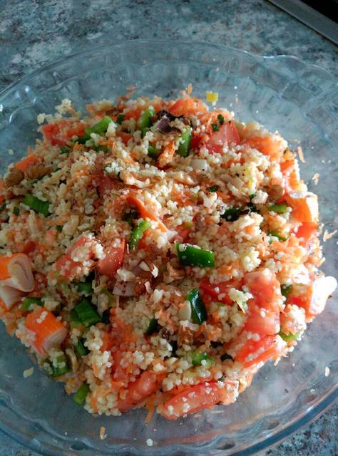 En una fuente partimos todos los demas ingredientes y echamos el cus-cus pasado el tiempo.. aliñar con las hojas de menta picadas el zumo de limon y la raspadura...
