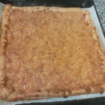 - En la bandeja del horno ponemos el hojaldre, dejamos el papel que trae así no se nos pegará y echamos la mezcla bien estirada por el hojaldre al horno durante 20 minutos a 200ºC o hasta que este el hojaldre hecho y las almendras tostadas.