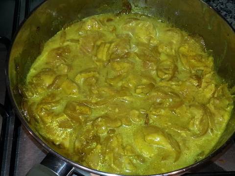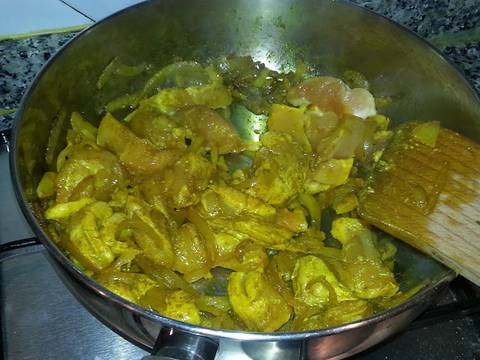 - Se sofríen las especias al fuego moderado en un poquito de aceite y luego la cebolla y el pollo troceado