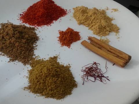 - Se hace un macerado con todas las especias molidas, el ajo, la sal y pimienta negra, los trocitos de piel de limón, el zumo de medio limón y el aceite. Se mezcla con los trozos de pollo y se guarda en un recipiente con tapa en el frigo durante unas 4 horas