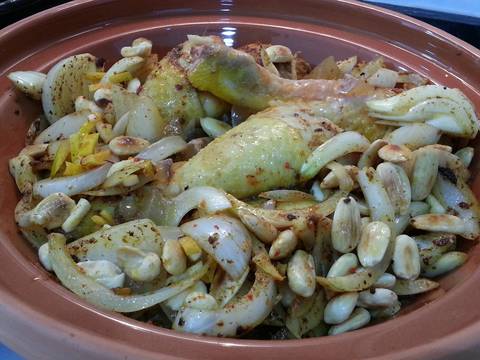 - Se agrega también el resto del macerado que ha quedado en el recipiente, el agua y el vino y las almendras tostadas, se tapa el tagine y se pone a fuego medio hasta que empiece a burbujear. Una vez burbujea, se baja el fuego al mínimo y se deja aproximadamente una hora.